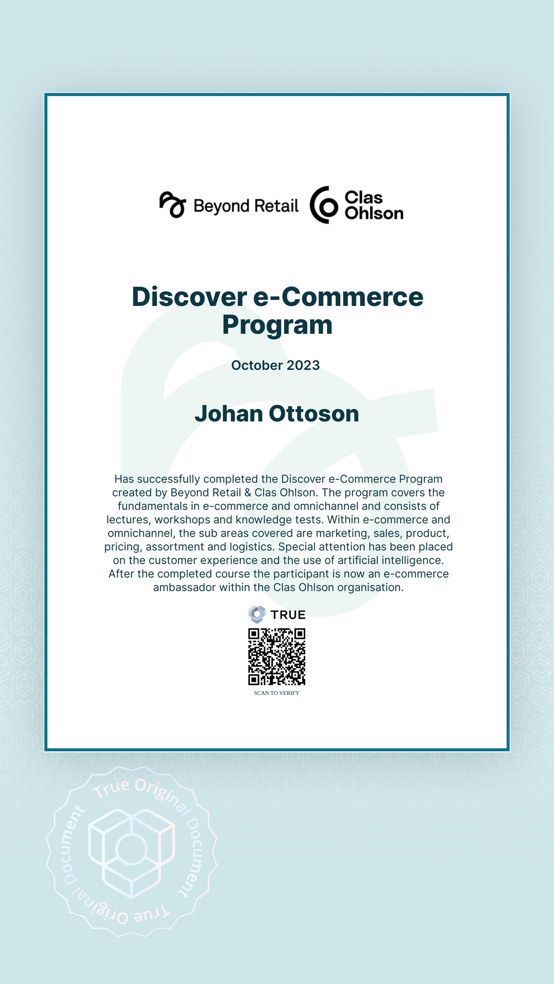 Alla TRUE -document är säkrade med blockchain-teknologi och kan verifieras som äkta. Klicka på verifieringsknappen bredvid dokumentet eller skanna QR-koden med din smartphones kamera. Ingen app krävs - dokumentets äkthet verifieras omedelbart.